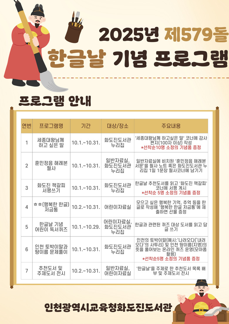 어린이자료실에서는 ‘행복한 한글 저금통’과 ‘어린이 독서퀴즈’가 진행되며, 일반자료실과 어린이자료실에서는 『제579돌 한글날』과 『한글날 이야기』를 주제로 한 도서 전시도 진행될 예정이다.