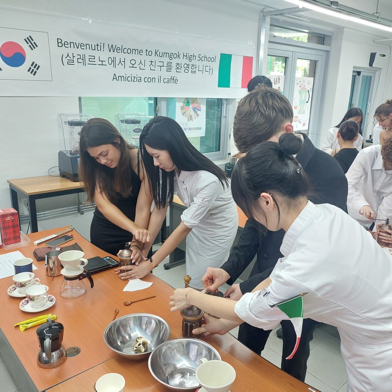 학생들은 △ 금곡고등학교 그린스마트 미래학교 시설에 대한 안내 및 투어를 시작으로 △ 바리스타학과 공동 실습 수업 △ 이탈리아를 주제로 한 세계사 수업 참여 △ 양국 학생 간 1:1 매칭 프로그램을 통한 문화교류 활동 등으로 프로그램이 구성되었다.