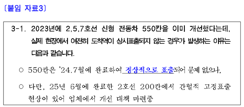 더욱이 개선을 완료한 차량에서도 문제가 발생했다. 공사 측은 “지난 6월 개선을 마친 2호선 200칸에서 간헐적으로 고정 표출 현상이 나타나 업체가 대책을 마련 중”이라고 설명했다. [※붙임 자료3]