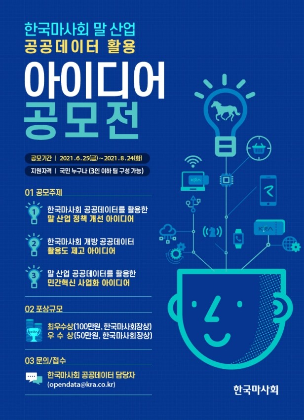 국민 참여를 통해 말산업 정책개선과 민간혁신 방안을 발굴하기 위한 이번 아이디어 공모전은 총 3개 분야로 ▲한국마사회가 개방하고 있는 공공데이터를 활용한 말 산업 정책 개선 아이디어 ▲한국마사회 개방 공공데이터의 활용도 제고 아이디어 ▲말 산업 민간 혁신 사업화 아이디어 중 선택해 제안할 수 있다.