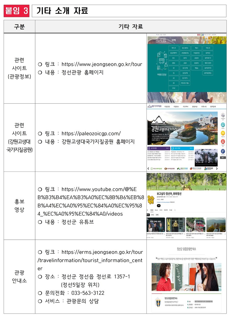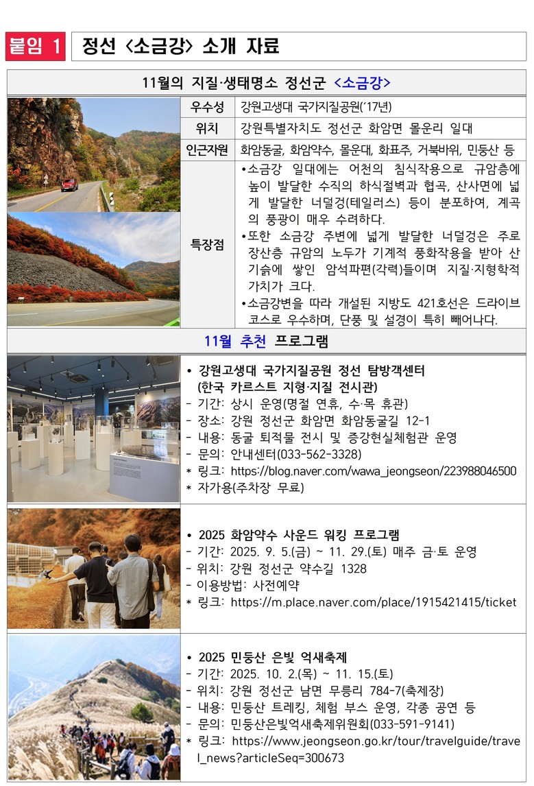 이와 함께 소금강 인근에서는 정선의 대표 가을 축제인 △‘민둥산 은빛 억새축제’(10.2.~11.15.)가 열려, 억새밭 트레킹, 지역 공연, 체험 부스 등 다채로운 행사가 진행된다. 또한 △‘화암약수 사운드 워킹 프로그램’(~11.29.)에서는 맑은 공기 속에서 자연의 소리를 테마로 한 힐링 트레킹을 즐길 수 있어, 지질 탐방과 함께 체험과 휴식을 모두 누릴 수 있다.