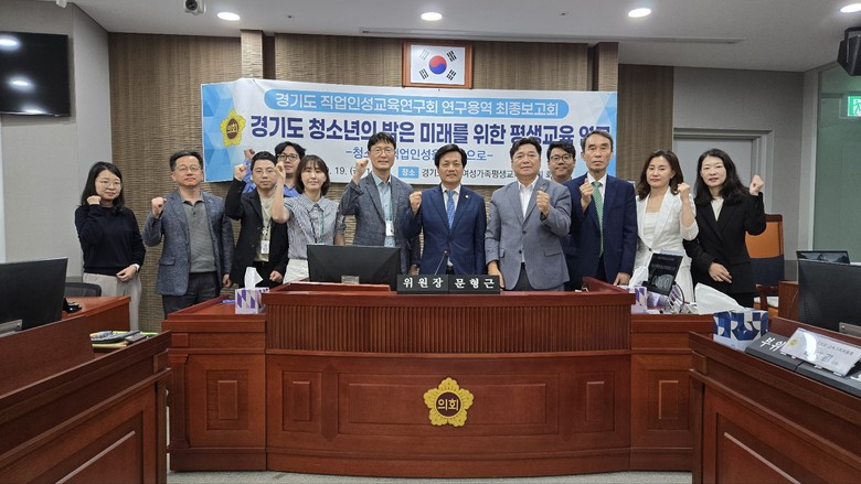 [경기도 세계타임즈=송민수 기자] 경기도의회 여성가족평생교육위원회 문형근 위원장(더불어민주당, 안양3)은19일 여성가족평생교육위원회 상임위원실에서 의원연구단체인 ‘경기도 직업인성교육연구회’(회장 박세원 의원, 무소속·화성3) 주관으로 진행된 정책연구용역 최종보고회를 마쳤다.