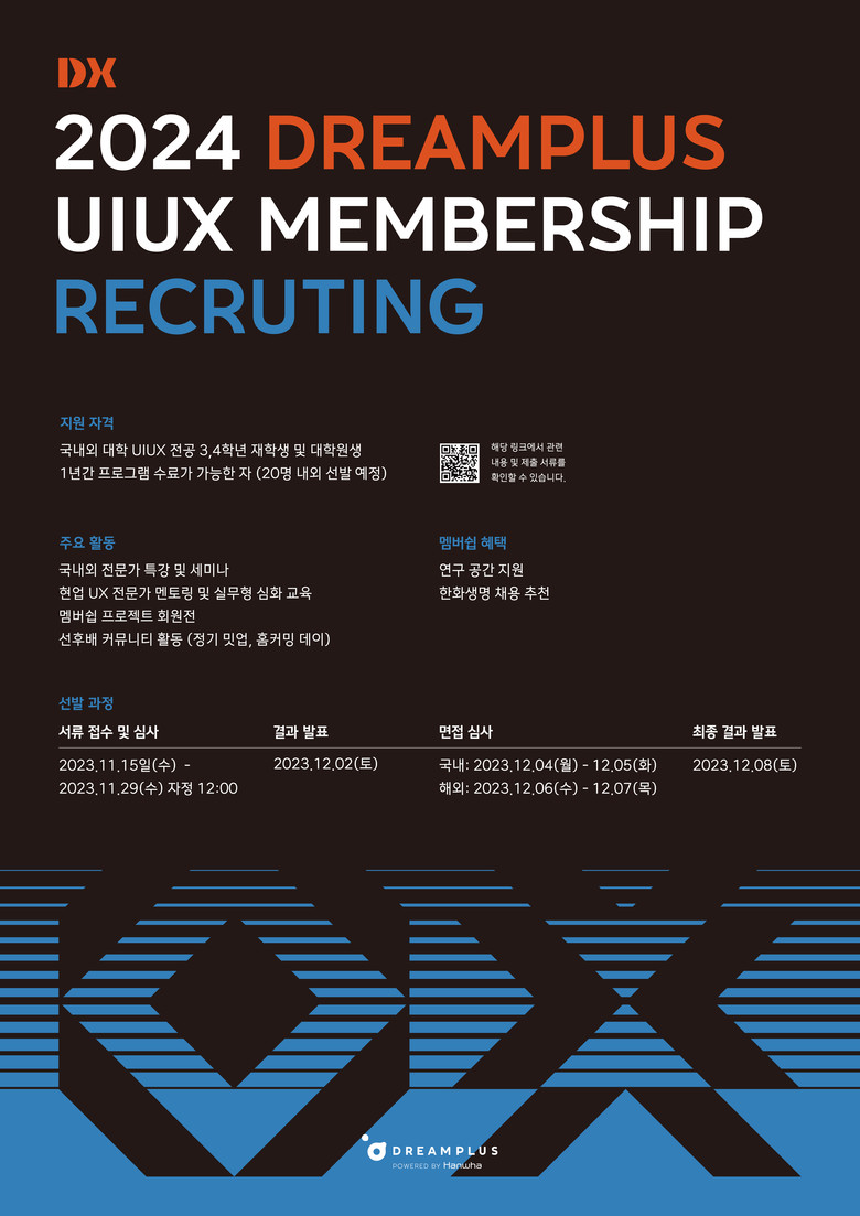 이번 ‘DX-멤버십’은 드림플러스의 청년 인재 양성 프로그램의 일환으로, 국내외 UX/UI 분야 관련 전공 3·4학년 대학생 또는 대학원생을 대상으로 한다.