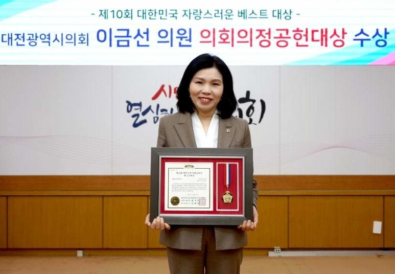 [대전 세계타임즈=이채봉 기자] 대전광역시의회 이금선 교육위원장(국민의힘, 구즉·관평·전민동)이 교육 분야 의정활동과 지역사회 발전을 위한 노력 등을 인정받아 ‘2026년 제10회 대한민국 자랑스러운 베스트대상 시상식’에서 ‘의회의정공헌대상’을 수상했다.