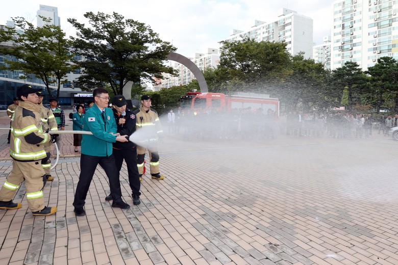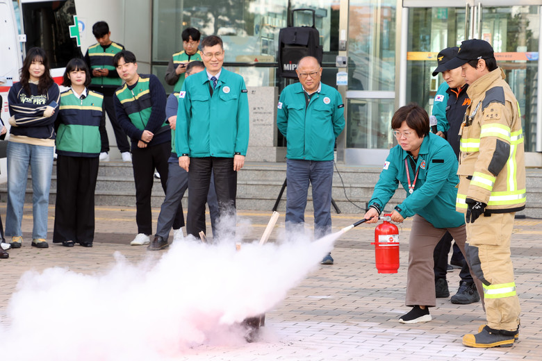 이날 훈련은 실질적인 화재 대응능력 향상을 위해 청사 5층에서 원인 미상의 화재 발생을 가정하고, 직원 및 민원인 긴급대피, 층별 소화기 및 소화전을 이용한 초동 진화, 응급환자 발생 시 환자 긴급 후송과 화재진화 교육 실습도 진행됐다.