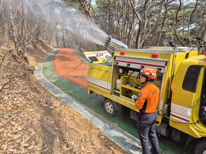 | ▲ 충청남도_서산소방서에서_보유한_제독차를_활용하여_산불취약지역에_대한_예비주수를_실시하고_있다 |