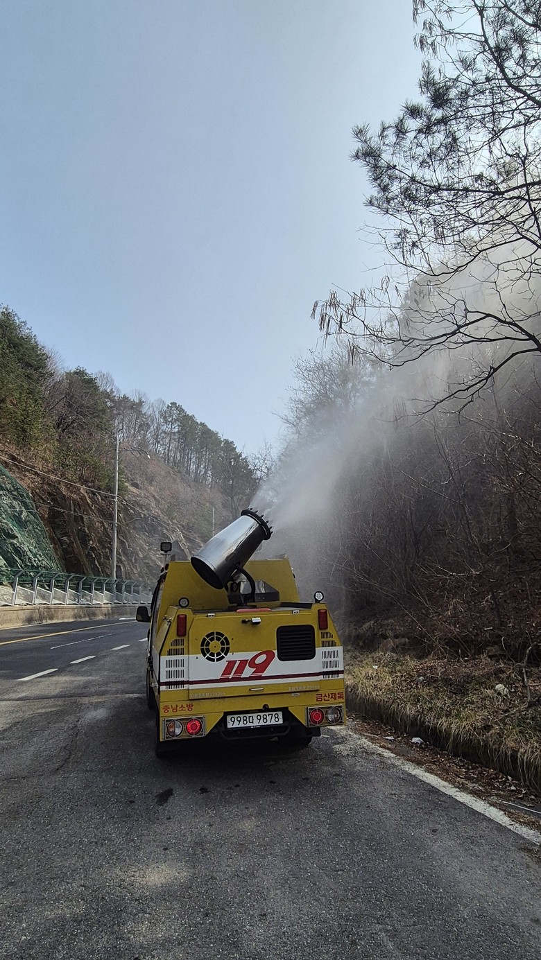 | ▲ 충청남도_금산소방서에서_보유한_제독차를_활용하여_산불취약지역에_대한_예비주수를_실시하고_있다 |