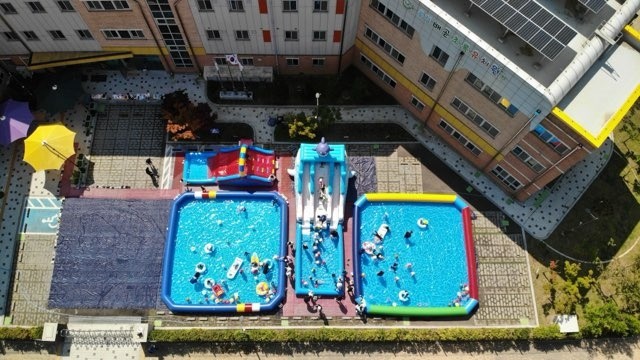 유치원 주차장에 대형 워터슬라이드 2개, 워터풀장 2개를 설치하고 슬라이드 타기, 다양한 종류의 튜브, 비치볼 등을 이용하여 물놀이를 진행하였다. 수상인명구조 자격을 갖춘 안전요원 3명 이상과 15명의학부모 자원봉사자, 5명의 유치원 교육자원봉사자 등 지원 인력을 배치하여 안전한 물놀이 체험이 될 수 있도록 운영하였다.