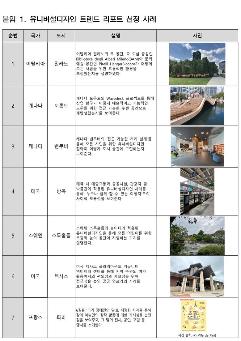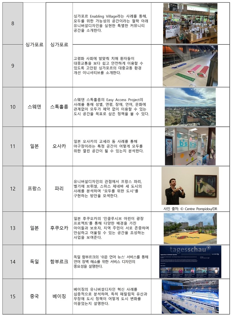 최종 심사를 거쳐 선정된 사례는 ▲스웨덴 스톡홀름 포용 놀이터 ▲싱가포르 치매 환자 친화 교통 환경 ▲태국 방콕 관광 인프라의 인클루시브 디자인 ▲중국 베이징 패럴림픽 유산 기반 도시정책 ▲독일 함부르크의 쉬운 언어 뉴스 등 12개 도시의 15건이다.