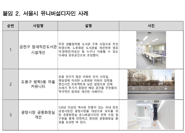 - 서울은 도서관·커뮤니티·공중화장실 개선, UD 컨설팅 통해 사회문제 해결 및 공간·개선 추진