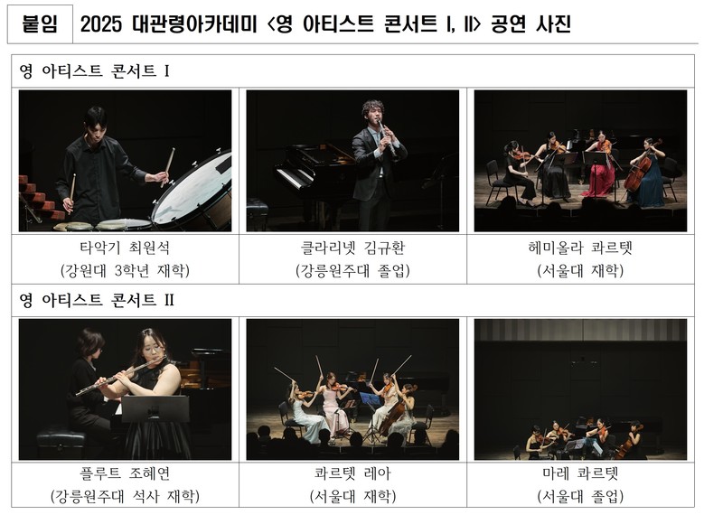 ‘영 아티스트 콘서트’는 강원도 내 음악대학 출신의 우수 인재와 대관령아카데미 시즌 교육프로그램인 ‘실내악 멘토십 프로그램’에 참여한 실력 있는 실내악 팀들이 무대에 올랐다. 미래의 클래식 음악계의 주역이 될 젊은 연주자들은 각자의 개성과 음악적 색채를 담은 프로그램을 선보이며 신진 연주자로서의 가능성과 잠재력을 유감없이 드러냈다. 전문 공연장에서 관객과 직접 호흡하는 무대를 통해 연주자들은 음악적 역량은 물론 무대 경험을 쌓는 의미 있는 시간을 가졌다.