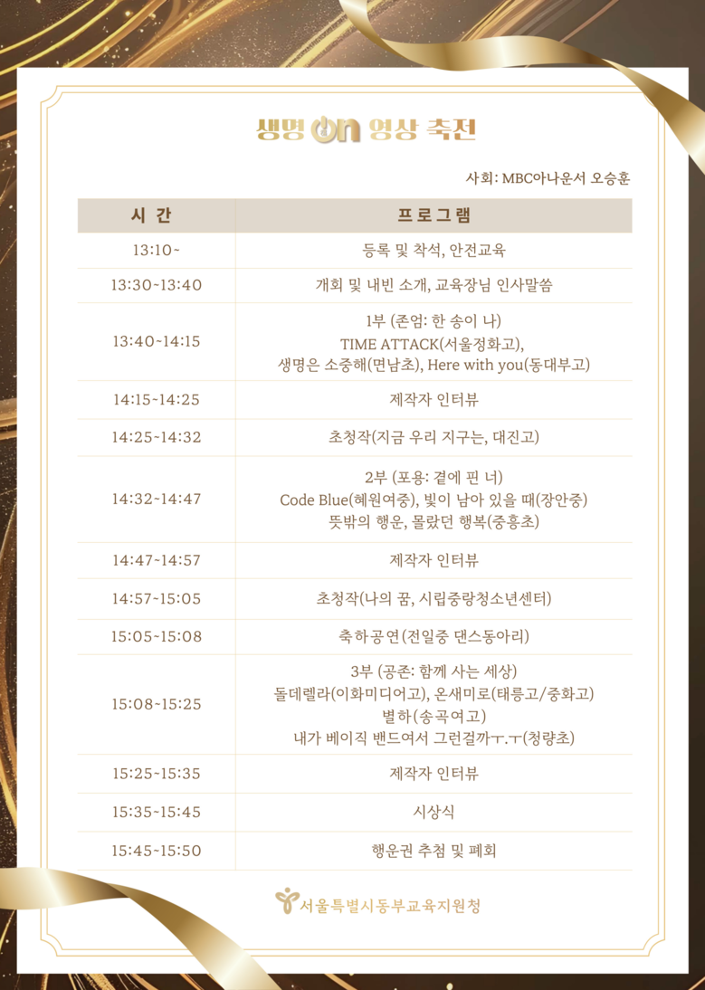 「생명ON 영상축전」 당일에는 1·2차 심사를 통과한 총 12편의 본선 작품이 먼저 상영되며, 수능을 마친 고3 학생과 전환기 청소년 등 참여를 희망한 학생들도 함께 관람할 예정이다. 작품 상영과 더불어 관객과의 대화, 우수작 시상, 행운권 추첨 등 다양한 프로그램이 이어지며, 축제의 사회는 MBC 아나운서 오승훈이 맡아 진행한다. 이번 축전을 찾은 모든 이들에게 따뜻한 위로와 공감의 메시지가 전달될 것으로 기대된다.
