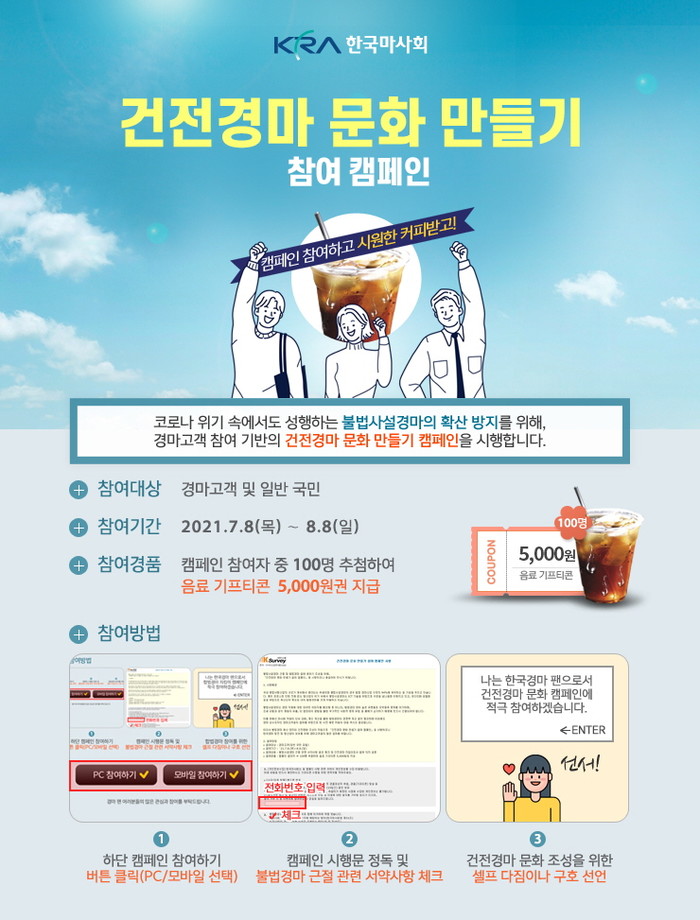 이에 한국마사회는 국민들과 함께 불법사설경마 근절 서약과 건전경마문화를 참여 독려 등 올바른 경마문화 전파를 위해 이번 캠페인을 시행한다. 한국마사회 홈페이지(www.kra.co.kr)를 통해 온라인으로 진행되는 이번 캠페인은 경마 팬은 물론 국민 누구나 참여 가능하며 추첨을 통해 참여자 100명에게 음료 기프티콘도 경품으로 제공한다.