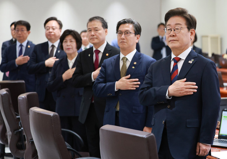 재명 대통령이 5일 서울 용산 대통령실 청사에서 열린 국무회의에서 국기에 경례를 하고 있다. 2025.6.5 [대통령실통신사진기자단]