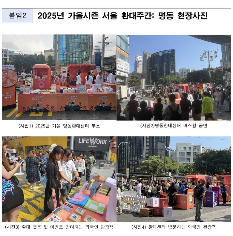 명동을 찾은 관광객은 설문 참여나 소셜미디어(SNS) 인증을 진행하면 서울의 감각을 담아 제작된 기념품(니트백, 비치타올, 갓키링, 민화, 티코스터, 궁궐통합관)을 받을 수 있다. 가족 단위 방문객이라면 컬링 체험이나 ‘케이팝 데몬 헌터스’ OST 거리공연 등도 즐길 수 있다.
