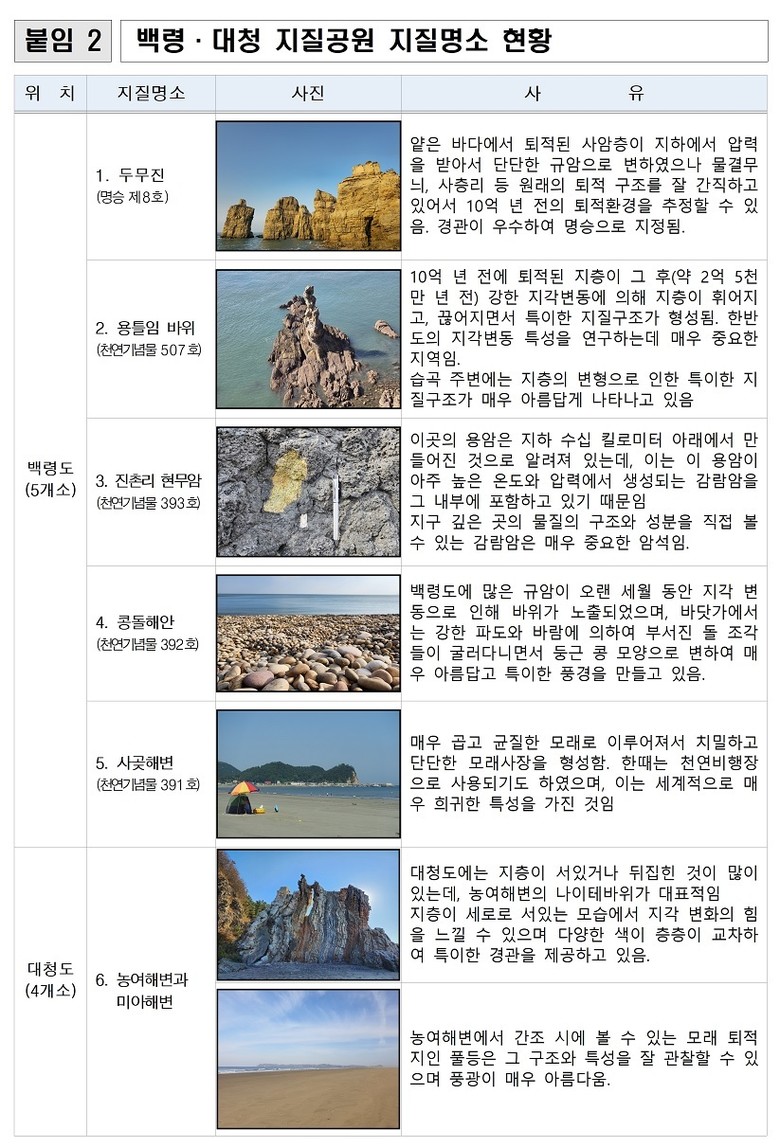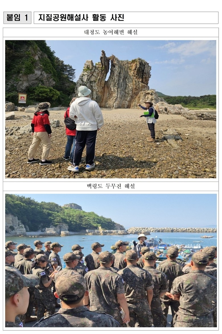 백령도와 대청도, 소청도로 구성된 백령·대청 국가지질공원은 2019년 환경부로부터 국가지질공원으로 인증을 받았다. 시는 2016년부터 지역 주민을 대상으로 해설사를 양성해 왔으며, 그 동안 30명을 배출해 2018년부터 현장 운영에 투입했다. 올해는 24명의 해설사가 활동할 예정이다.