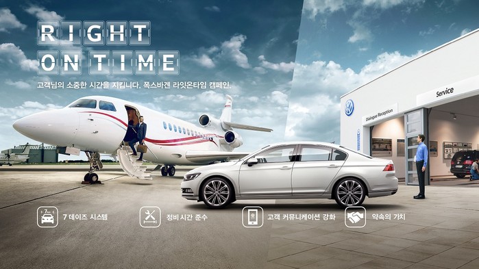 ‘라잇온타임(Right on Time)‘ 캠페인은 정비를 예약하는 시작점부터 정비가 완료된 차량을 받는 마지막 순간까지 약속한 정비 기간과 고객의 소중한 시간을 지킴으로써 서비스 만족도를 더욱 높여가겠다는 폭스바겐의 약속이자 의지를 담았다.