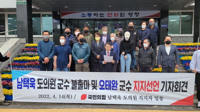 남 도의원은 이날 입장문에서 "저는 오늘부터 의령군수의 꿈을 접고 오태완 현 의령군수를 지지하기로 결심했다"며 의령군수에 도전해 새로운 의령 발전의 전기를 마련하고 싶었던 남택욱의 꿈을 오태완 군수가 저를 대신해 이뤄줬으면 한다"고 밝혔다.