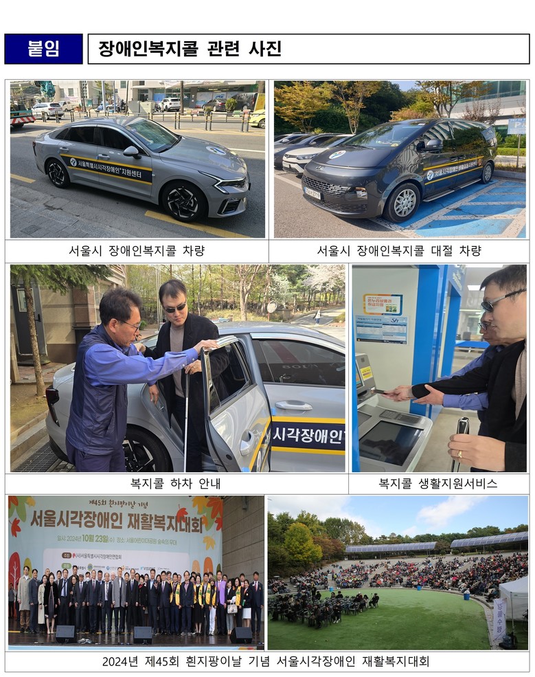 흰지팡이가 시각장애인 도보 이동의 필수 수단이라면, 장애인복지콜은 혼자서 대중교통 이용이 불편한 시각장애인들의 장거리 이동을 위한 필수 서비스이다. 현재 서울시각장애인등생활지원센터에서는 161대의 차량으로 24시간 콜택시 서비스를 제공 중이며, 센터에 등록된 30,000여 명의 중증 시각장애인과 신장장애인의 발이 되어주고 있다.