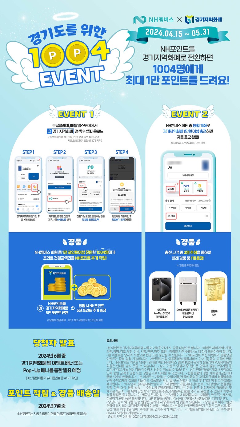 성남, 시흥, 연천, 포천, 가평, 파주, 김포, 부천, 광명, 과천 제외 이번 이벤트는 두 가지 방식으로 진행한다. 이벤트❶은 NH포인트(1천 NH포인트 이상)를 경기지역화폐 포인트로 전환한 고객 중 1,004명을 추첨해 포인트 전환금액(최대 1만 포인트)만큼 NH포인트를 추가 적립한다.