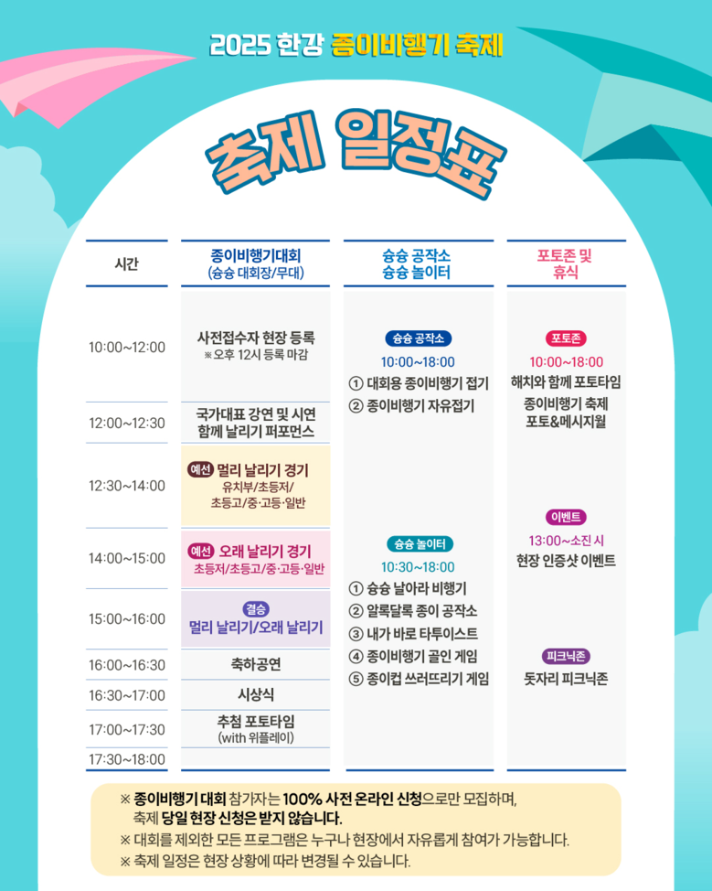 서울시는 「2025 한강 종이비행기 축제」를 10월 18일(토) 10시부터 18시까지 한국 최초의 비행장 역사를 간직한 여의도한강공원에서 개최한다고 밝혔다.