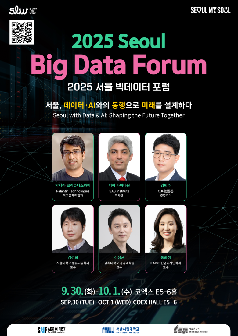서울 빅데이터 포럼은 글로벌 석학과 기업들이 모여 도시 운영 혁신의 청사진을 논의하는 핵심 무대다. 올해 포럼의 슬로건은 ‘서울, 데이터·AI와의 동행으로 미래를 설계하다(Seoul with Data & AI: Shaping the Future Together)’로, AI와 데이터가 도시 발전을 견인하는 방향을 집중적으로 조망한다.