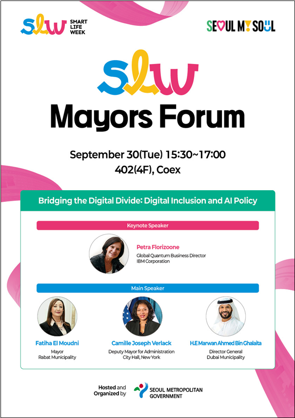SLW 2025의 하이라이트 중 하나인 메이어스 포럼은 ‘디지털 격차 해소를 위한 디지털 포용과 AI 정책(Bridging the Digital Divide: Digital Inclusion and AI Policy)’을 주제로 열린다.