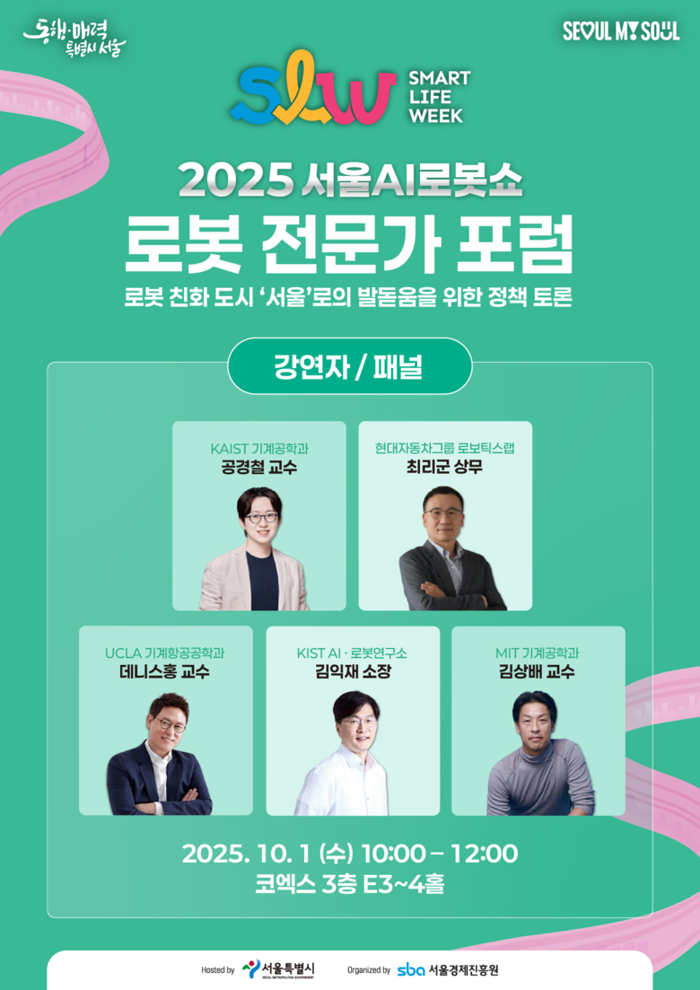 로봇 전문가 포럼은 10월 1일(수) 오전 10시부터 11시 50분까지, 코엑스 E홀 3·4에서 열린다. 서울경제진흥원이 주관하는 이번 포럼은 ‘로봇 친화 도시’로 나아가기 위한 서울의 비전과 전략을 집중적으로 다룬다.