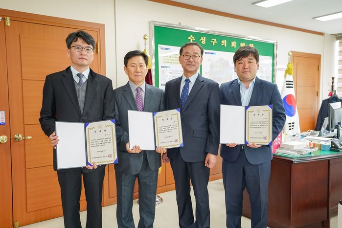 [수성구=세계타임즈 한성국 기자] 대구광역시 수성구의회(의장 김희섭)는 4월 11일 의장실에서 2018 회계연도 결산검사를 수행할 3명의 결산검사위원을 위촉했다.