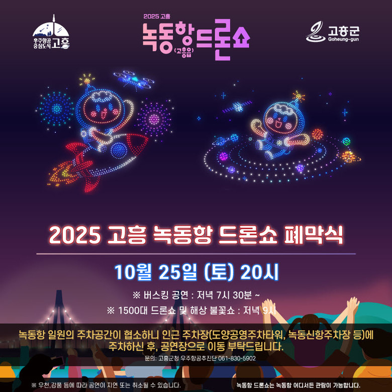 군 우주항공추진단 관계자는 “1500대 드론과 레이저 빔을 활용한 해상 불꽃, 음악이 어우러져 군민과 관객들에게 잊지 못할 감동을 선사할 예정이다”며 “10월 25일 많은 분이 소중한 분들과 함께 녹동항을 찾아 특별한 추억을 만들기 바란다”고 말했다.