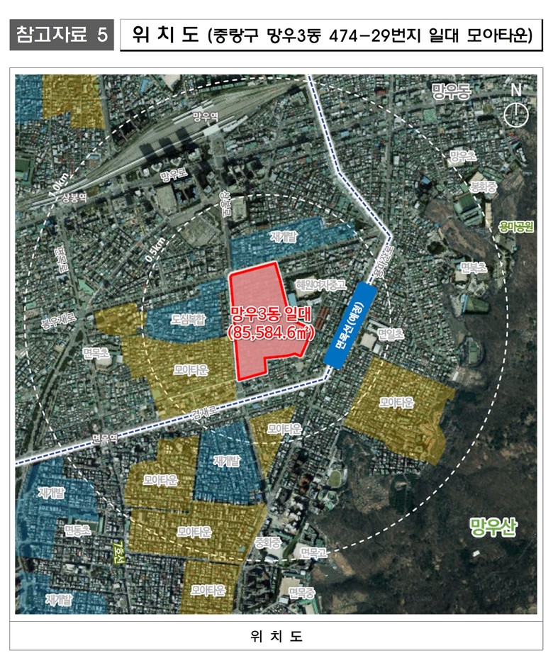 이 지역은 경춘선·경의중앙선 망우역과 신설 예정인 면목선 경전철과 인접하고, 인근 여러 모아타운 대상지와 재개발이 활발히 추진되고 있어, 이번 모아타운 추진으로 지역 전반 발전이 기대된다.