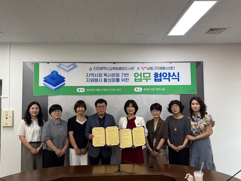 [인천 세계타임즈=심하린 기자] 인천광역시교육청중앙도서관(관장 곽미혜)은 남동구자원봉사센터(센터장 이두형)와 27일 ‘지역사회 독서 문화 기반 자원봉사 활성화를 위한 업무협약’을 체결했다.