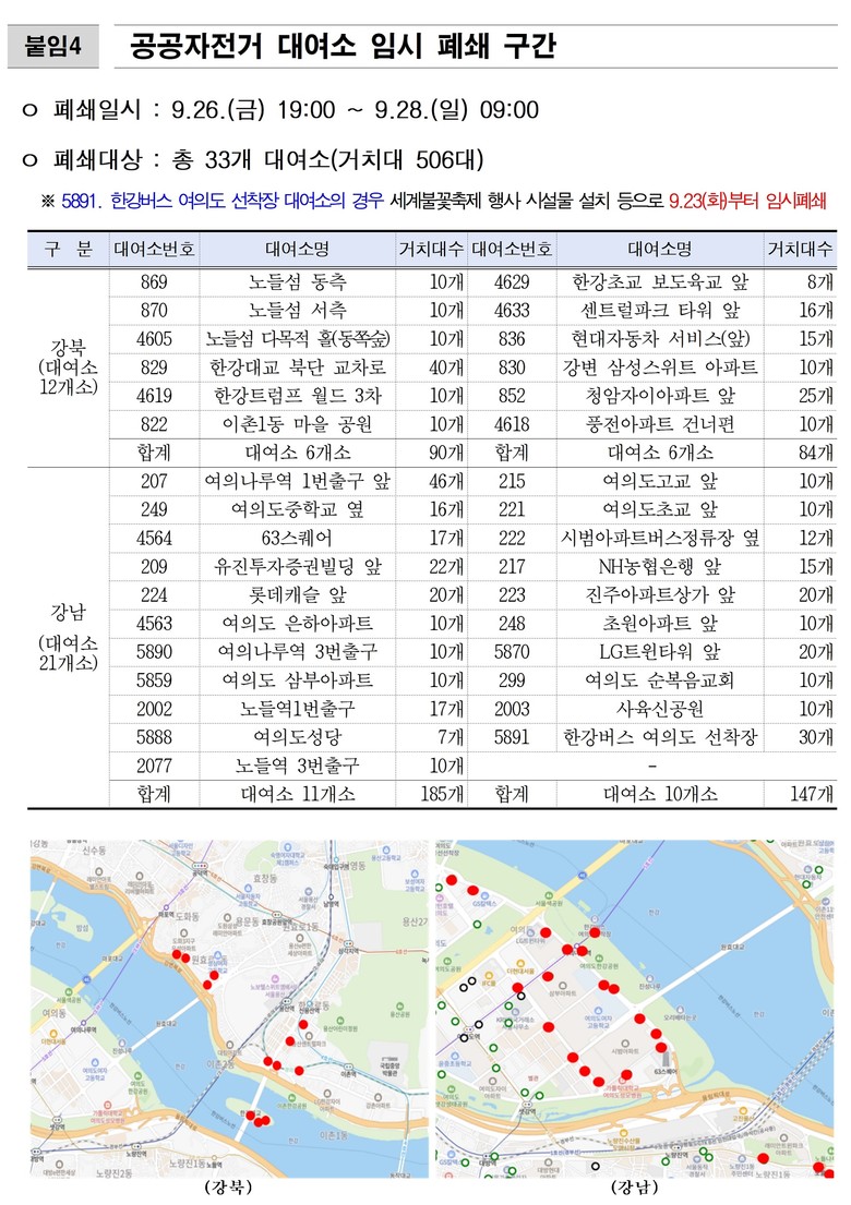 또한 평소 관람객이 몰리는 여의도·마포·용산·동작구 일대에는 공공자전거 따릉이, 민간 대여 개인형 이동장치·전기자전거(7개 대여업체) 대여 및 반납이 일시 중지(9.26.(금) 19시~9.28.(일) 09시)된다.
