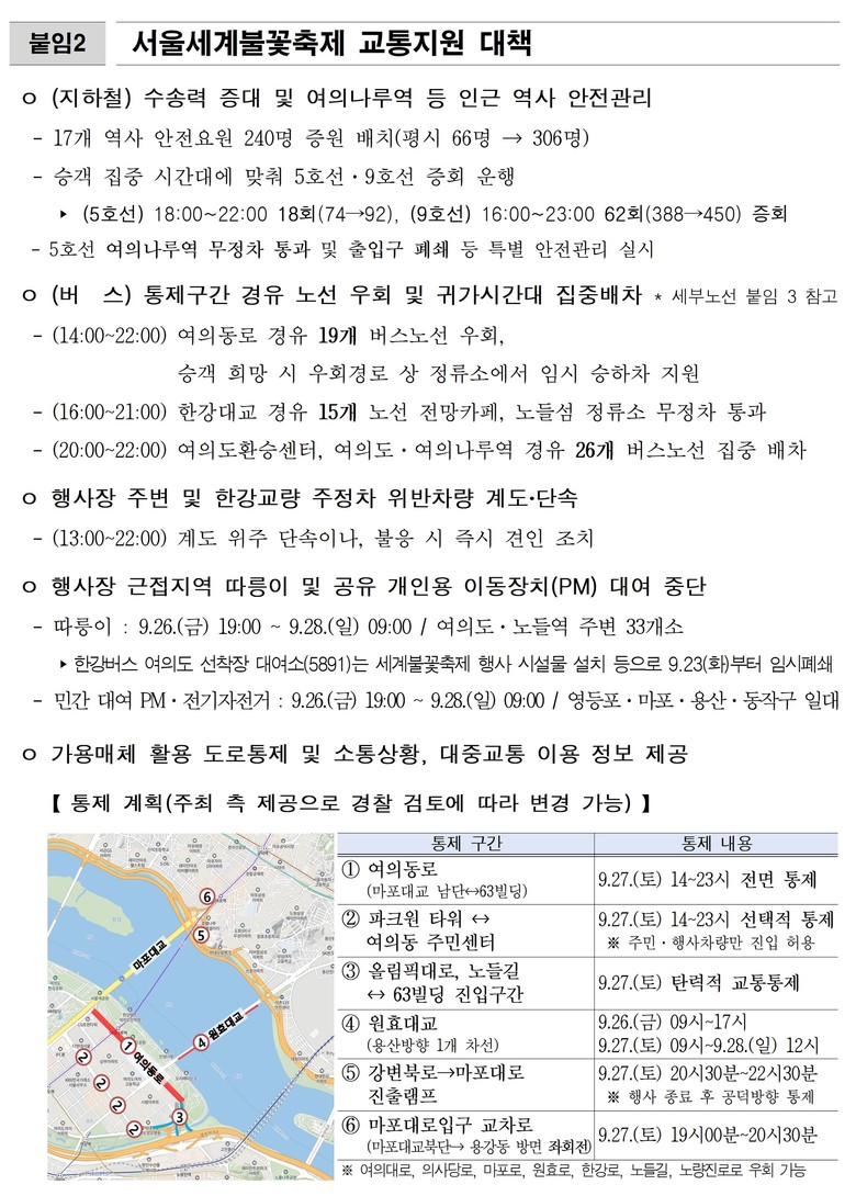 축제 당일에는 행사장과 인접한 5호선 여의나루역은 혼잡 시 무정차 통과, 출입구 폐쇄가 이뤄질 수 있어 관람객은 여의도역·마포역·샛강역 등 인근 역을 미리 확인해야 한다.