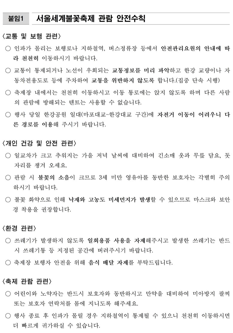 김태희 서울시 문화본부장은 “지난 20년간 서울의 가을 하늘을 불꽃으로 수놓으며 대표적인 축제로 자리매김한 ‘서울세계불꽃축제’가 올해도 안전하게 마무리될 수 있도록 모든 행정력을 집중할 것”이라며, “행사 중 안전 수칙뿐 아니라 축제가 끝나고 귀가하실 때도 안전요원의 안내에 따라 질서를 지켜 귀가해 주시길 당부드린다”라고 말했다.