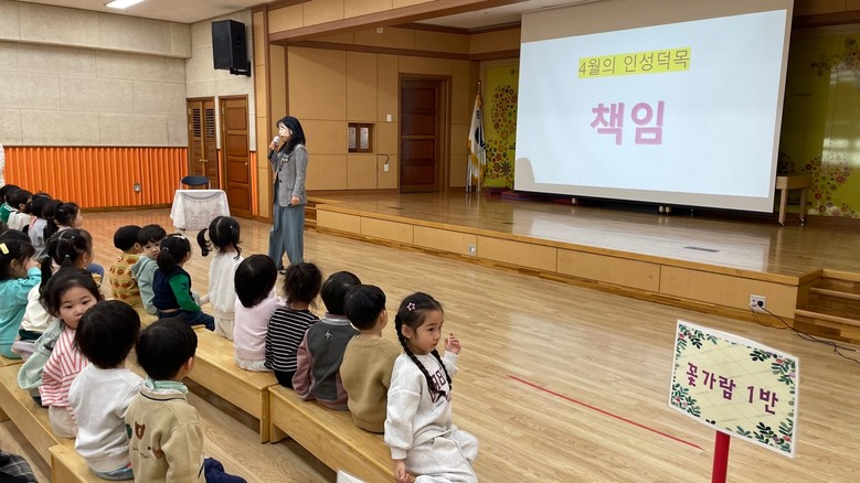 4월 인성덕목은 ‘책임’이다. 아이들은 ‘책임은 스스로 자기 일을 책임지는 것’이고 ‘정리정돈을 잘하는 것’, ‘도와주는 것’ 등이 ‘책임’이라고 이야기하였다.