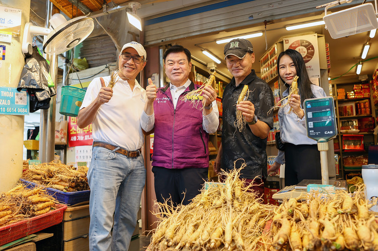 | ▲ 청량리 전통시장 방문한 타니 쌩랏 주한태국대사(왼쪽 첫번째)가 이필형 동대문구청장과 인삼을 들고 기념촬영을 하고 있다. |