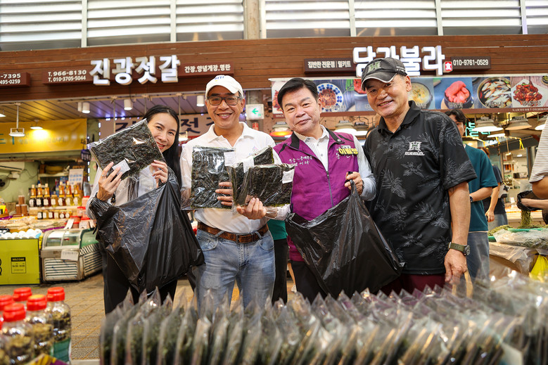 | ▲ 청량리 전통시장 방문한 타니 쌩랏 주한태국대사(왼쪽 두번째)가 이필형 동대문구청장과 김을 들고 기념촬영을 하고 있다. |