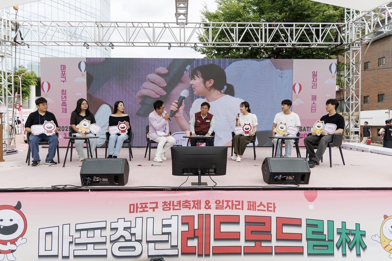 | ▲ ‘2025 마포구 청년축제&일자리페스타’에서 청년 패널들과 박강수 마포구청장이 청년 정책에 대해 이야기를 나누고 있다. |