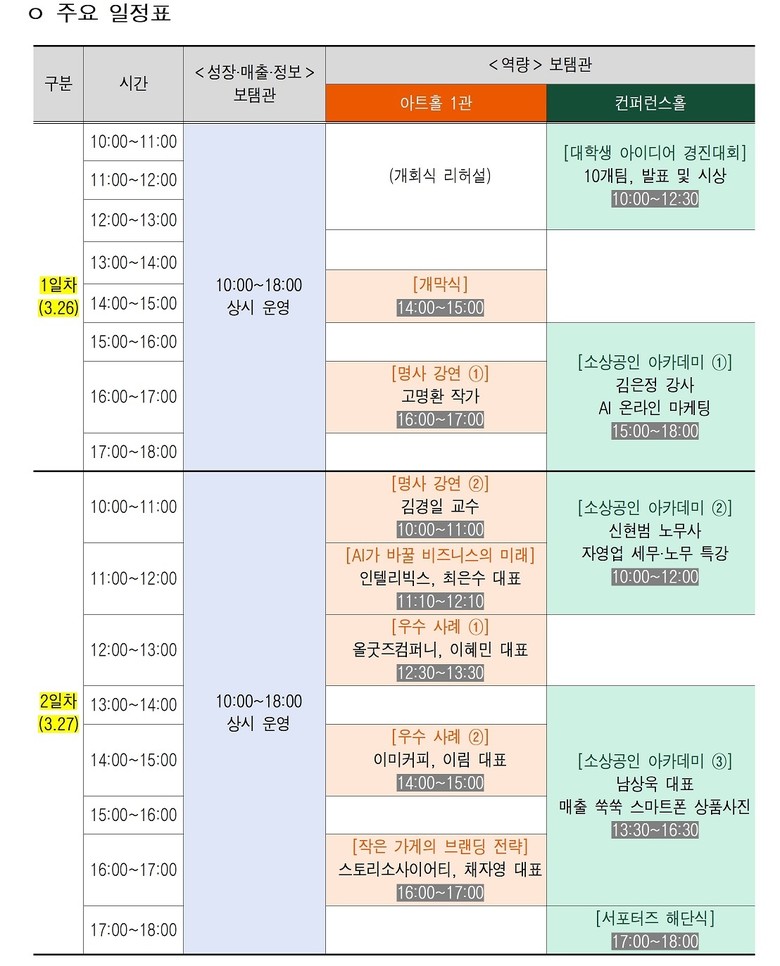 박람회는 ▴성장보탬관 ▴매출보탬관 ▴역량보탬관 ▴정보보탬관 등 총 4개의 테마관으로 구성되며, 소상공인의 경영 안정과 매출 확대를 위한 다양한 프로그램이 운영된다.