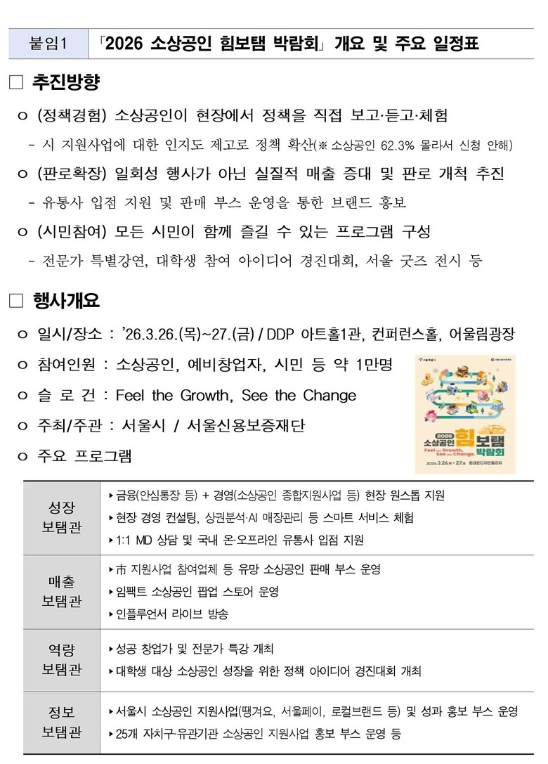 - 대학생 아이디어 경진대회, 서울 브랜드 굿즈 선호도 투표 등 다양한 프로그램 진행 [서울 세계타임즈=이장성 기자] 서울시와 서울신용보증재단(이하 재단)은 26일(목)과 27일(금), 동대문디자인플라자(DDP)에서 소상공인의 성장과 경영 안정을 위해 정책과 정보를 총망라한 서울시 최초 소상공인 종합박람회인 ‘2026 소상공인 힘보탬 박람회’를 개최한다.
