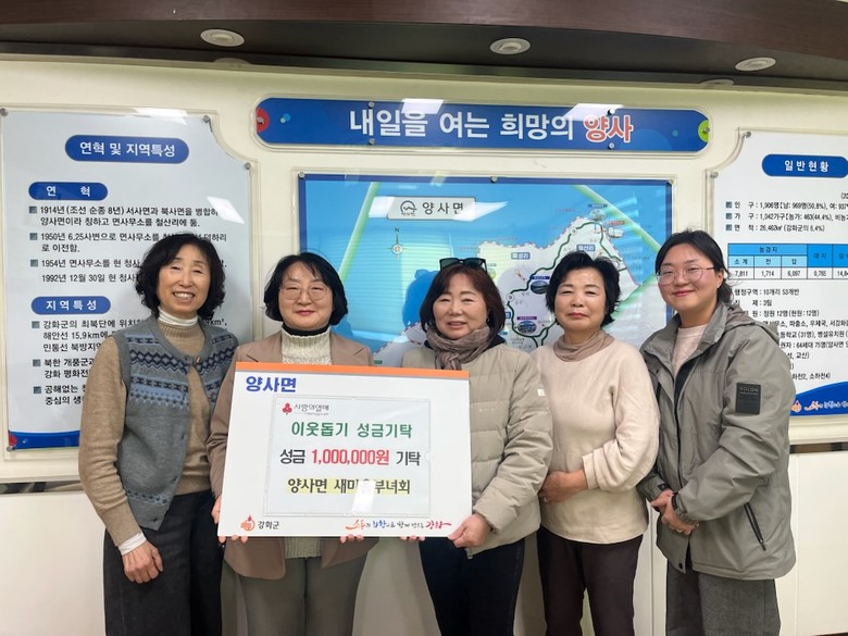 이번 기부에는 양사면 새마을부녀회에서 100만 원을, 양사면 생활개선회에서 50만 원을 기탁해 총 150만 원의 성금이 모였다.