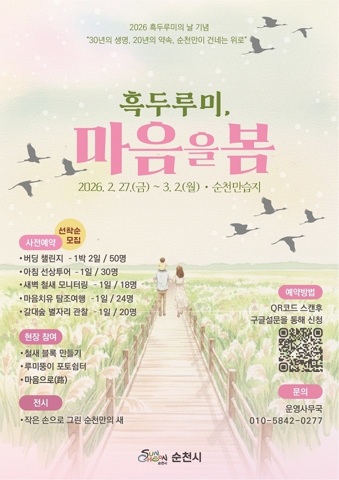 - 치유와 탐조가 만나는 새벽 모니터링·선상투어·버딩챌린지 등 다양한 프로그램 운영 - [순천시 세계타임즈=우덕현 기자] 순천시는 2월 27일부터 3월 2일까지 ‘2026 순천만 흑두루미의 날’을 맞아 「3인 3색 순천 릴레이 토크 콘서트」와 「순천만 치유·탐조 프로그램」을 운영한다고 밝혔다.