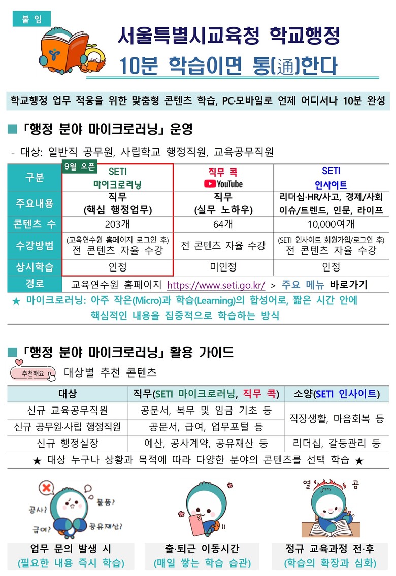 - 203개 실무 과정, PC·모바일 언제 어디서나 10분 완성 [서울 세계타임즈=이장성 기자] 서울특별시교육청(교육감 정근식) 산하 서울시교육청교육연수원(원장 박숙희)은 9월 1일부터 학교 행정 실무를 10분 안에 핵심만 익히는‘SETI 마이크로러닝’을 운영한다.