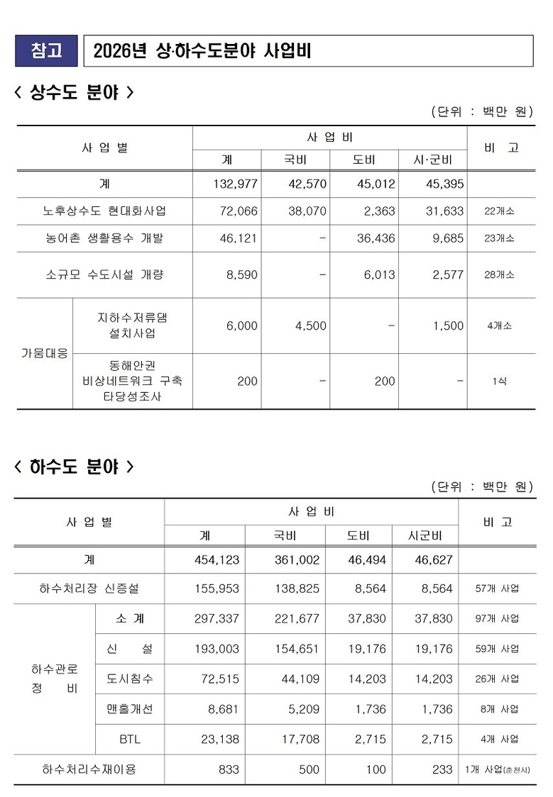 하수도 분야에는 전년도 3,918억 원 대비 623억 원(16%) 증가한 역대 최대 규모 4,541억 원을 투입한다. 하수처리장 신·증설 57개 사업에 1,560억 원, 하수관로 정비 97개 사업에 2,973억 원, 하수처리수 재이용 사업 1개소에 8억 원을 투자해 처리시설을 확충하고 노후 기반을 개선한다.