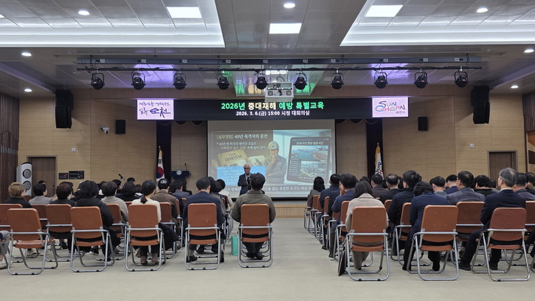 [순천시 세계타임즈=우덕현 기자] 순천시는 중대재해를 예방하기 위해 지난 6일 전 직원을 대상으로 특별교육을 실시했다. 5급 이상 간부 공무원은 시청 대회의실에서 집합교육으로, 6급 이하 전 직원은 사무실에서 CATV(청내방송)를 통해 모든 직원이 교육에 참여했다.