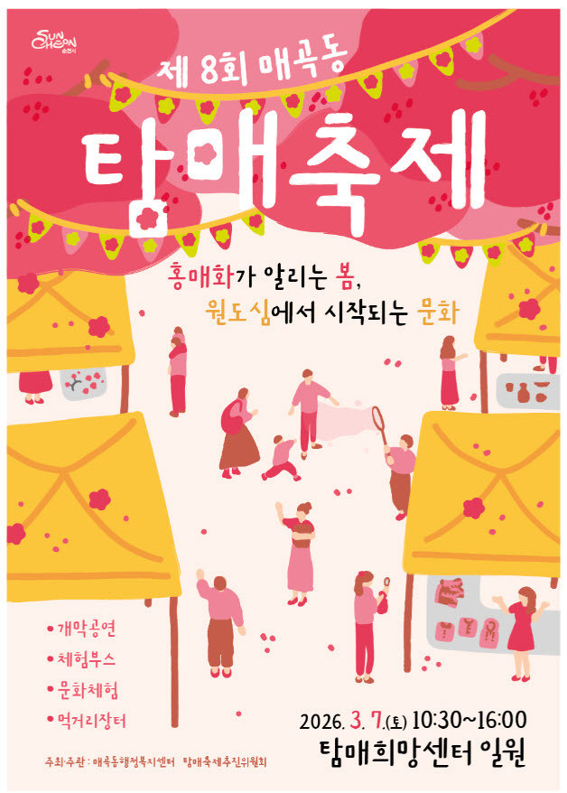 올해 순천시 첫 축제의 시작을 알리는 이번 탐매축제는 ‘붉게 피어난 홍매화 아래, 문화의 봄이 시작되는 탐매축제’를 콘셉트로 원도심 매곡동의 지역 특색을 살린 세대공감 문화콘텐츠를 선보인다. ▲다양한 체험 프로그램을 통해 오감으로 봄기운을 느끼는‘감각’ ▲홍매화와 어우러져 ‘감동’을 더할 공연 ▲홍매화 아래 잠시 머물며 쉼과 여유를 누릴 수 있는 힐링 공간을 통한 ‘치유’를 담아, 축제를 찾은 시민과 관광객 모두가 보고, 듣고, 느끼며 즐기는 봄날의 추억을 선사할 예정이다.