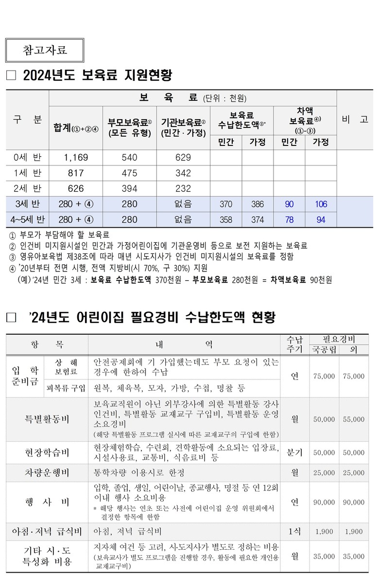 어린이집 보육료 수납한도액은 정부 결정 보육료를 따르되, 인건비를 지원받지 못하는 민간‧가정 어린이집의 3~5세반은 전년 대비 5000원씩 인상했다.