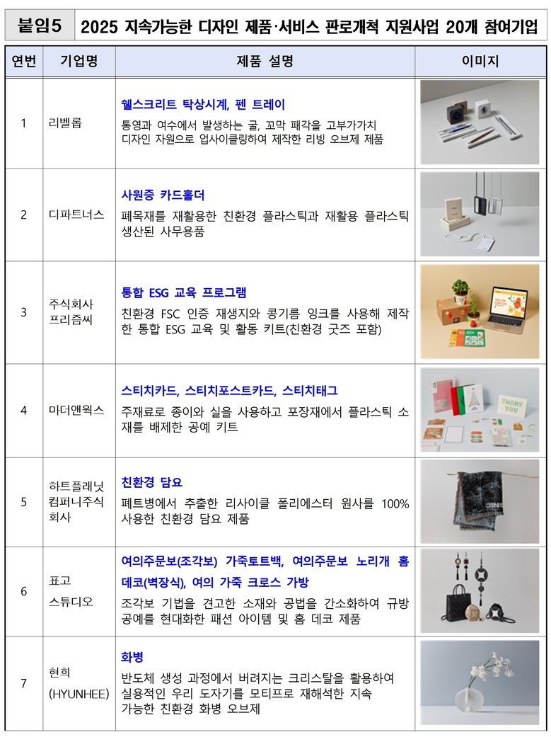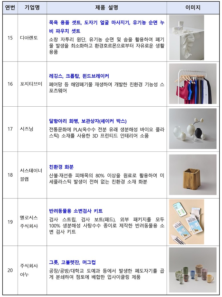 이번 행사에는 폐섬유, 페트병, 재생 가죽, 자연분해성·재활용성 소재 등을 사용한 제품·서비스를 보유한 우수 디자인기업 20곳이 참여한다. 자투리 플라스틱을 활용해 친환경 사무용품을 만드는 ‘피그랩’, 폐어망 등을 재생하여 개발한 스포츠웨어 ‘포지티브미’ 등의 지속가능한 디자인 제품을 만날 수 있다.