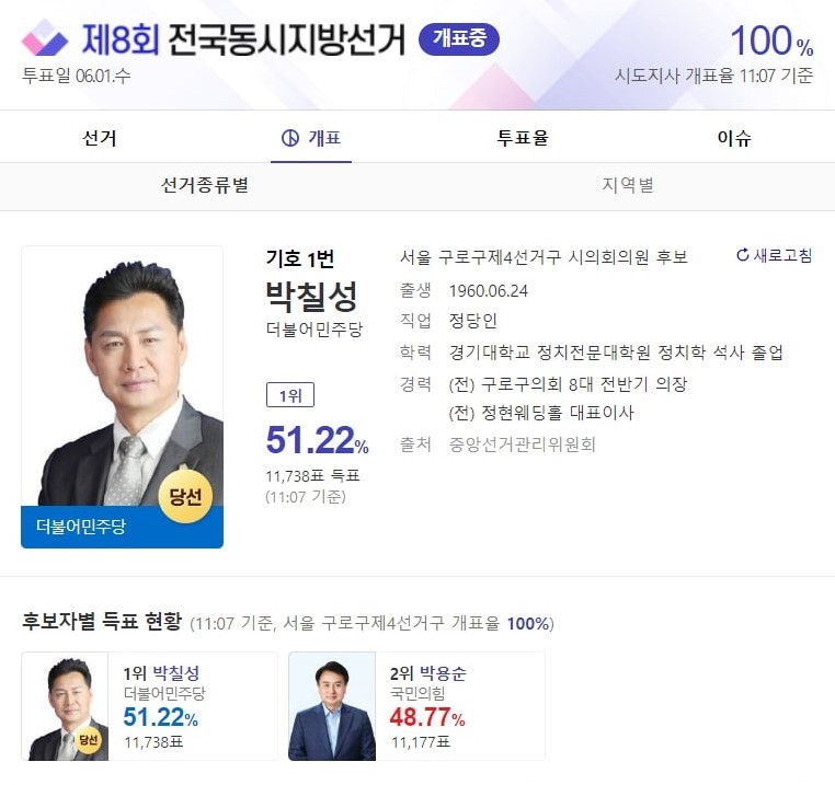 [세계타임즈 백진욱 기자] 더불어민주당 박칠성 후보가 제 8회 전국동시지방선거 서울 구로구제4선거구에서 시의회의원으로 당선됐다.